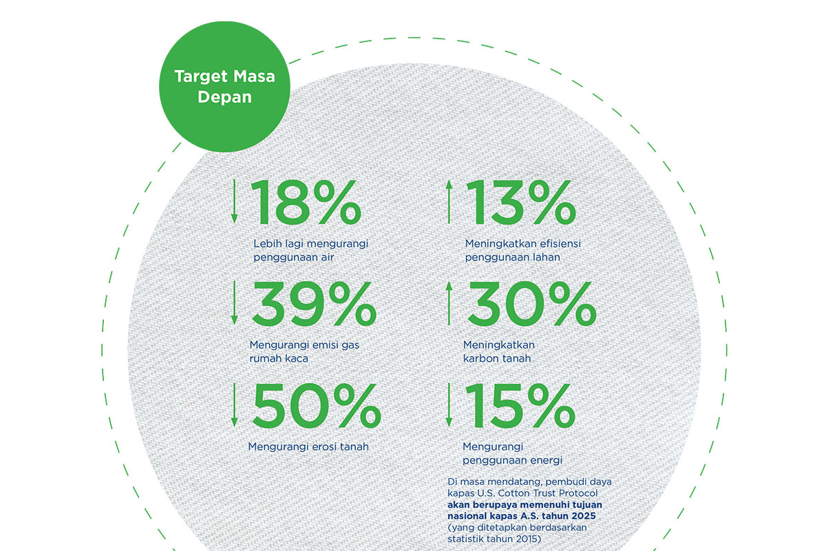 Sebagai sebuah industri, kapas AS memiliki tujuan dampak lingkungan yang ambisius dan Trust Protocol adalah salah satu cara untuk memajukan jalan menuju kesuksesan yang lebih besar. Enam tolok ukur perbaikan berkesinambungan dari Trust Protocol dalam penggunaan lahan, konservasi tanah, penggunaan energi, emisi gas rumah kaca, karbon tanah, dan penggunaan air irigasi sejalan dengan tujuan nasional industri kapas AS tahun 2025.