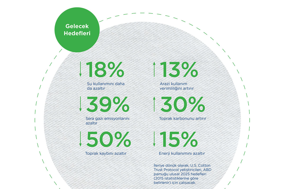 Bir endüstri olarak ABD pamuğunun iddialı çevresel etki hedefleri vardır ve Güven Protokolü, daha büyük bir başarıya giden yolu ilerletmenin bir yoludur. Güven Protokolü'nün arazi kullanımı, toprak koruma, enerji kullanımı, sera gazı emisyonları, toprak karbonu ve su kullanımına ilişkin altı sürekli iyileştirme metriği, ABD pamuk endüstrisinin 2025 ulusal hedefleriyle uyumludur.